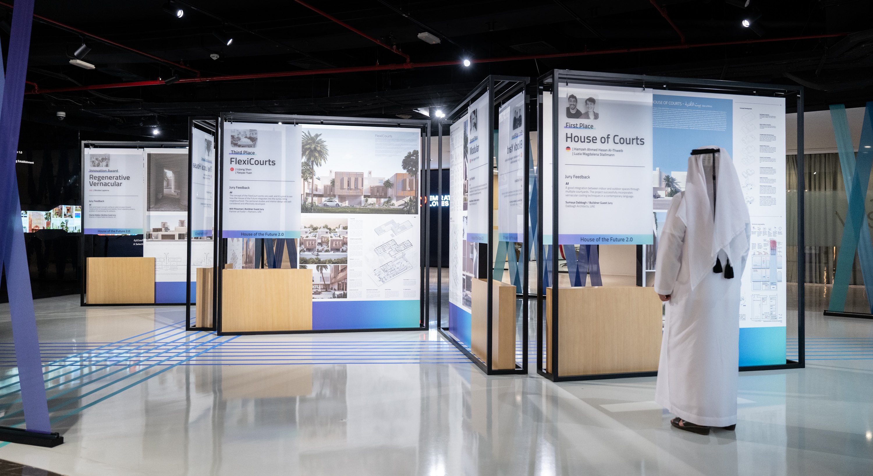 وحصد حمزة أحمد حسن الثويب ولوتسيا ماغدالينا شتالمان من ألمانيا المركز الأول عن مشروعهما "بيت الأفنية" الذي يجسد روح العمارة الإماراتية الأصيلة بعناصرها التراثية مثل البراجيل والأفنية الداخلية في قالب حديث ومستدام، فيما نال مشروع "نموذج للمنازل المتطورة" للمعماري مارك إيزاغويري سيرانو من ألمانيا المركز الثاني، وهو تصميم معياري مرن يتكيف مع احتياجات المدن المستقبلية.