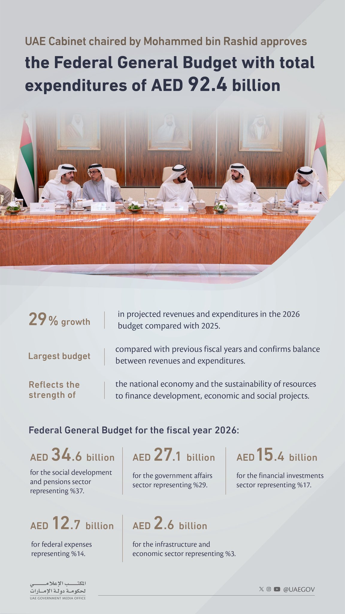 جاء ذلك عقب اعتماد مجلس الوزراء برئاسة صاحب السمو الشيخ محمد بن راشد آل مكتوم، نائب رئيس الدولة، رئيس مجلس الوزراء، حاكم دبي "رعاه الله"، خطة الميزانية العامة للاتحاد للسنة المالية 2026، بإجمالي 92.4 مليار درهم، مقارنة بـ71.5 مليار درهم في ميزانية العام 2025، بما يمثل قفزة نوعية بنسبة تقارب 29%، حيث تعد هذه الميزانية الاتحادية الأكبر مقارنة بميزانيات السنوات المالية السابقة، ما يعكس قوة الاقتصاد الوطني والالتزام بدعم مسيرة التنمية المستدامة في الدولة.