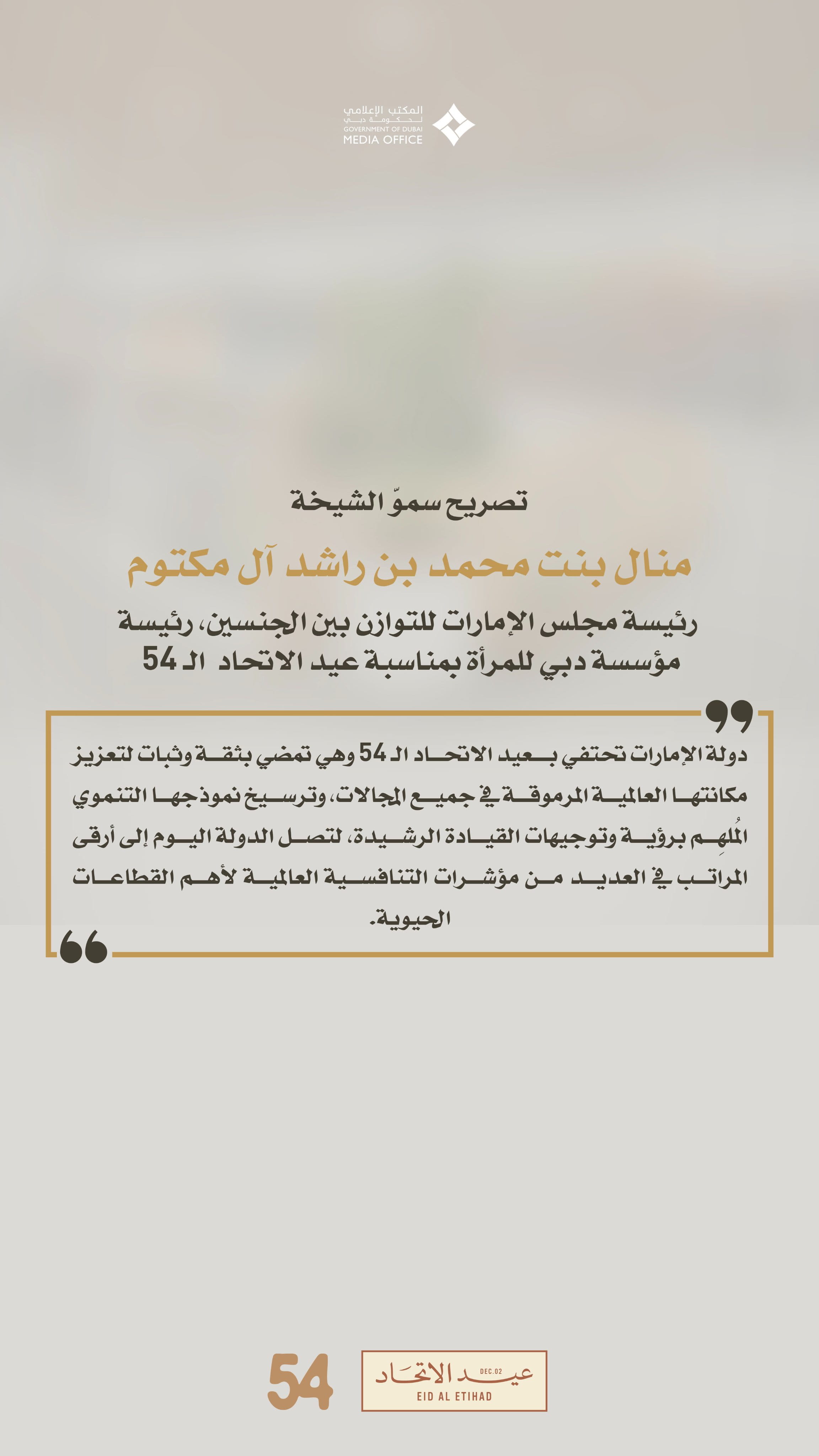Her Highness Sheikha Manal bint Mohammed bin Rashid Al Maktoum, President of the UAE Gender Balance Council (UAE GBC), President of the Dubai Women Establishment (DWE), wife of His Highness Sheikh Mansour bin Zayed Al Nahyan, Vice President, Deputy Prime Minister, and Chairman of the Presidential Court, affirmed that the UAE, as it celebrates its 54th Eid Al Etihad, continues to advance with confidence and determination toward strengthening its distinguished global position across all sectors. Guided by the forward-looking vision and directives of its leadership, the UAE has achieved exceptional rankings on a wide range of global competitiveness indicators, showcasing a development model that continues to inspire the world.