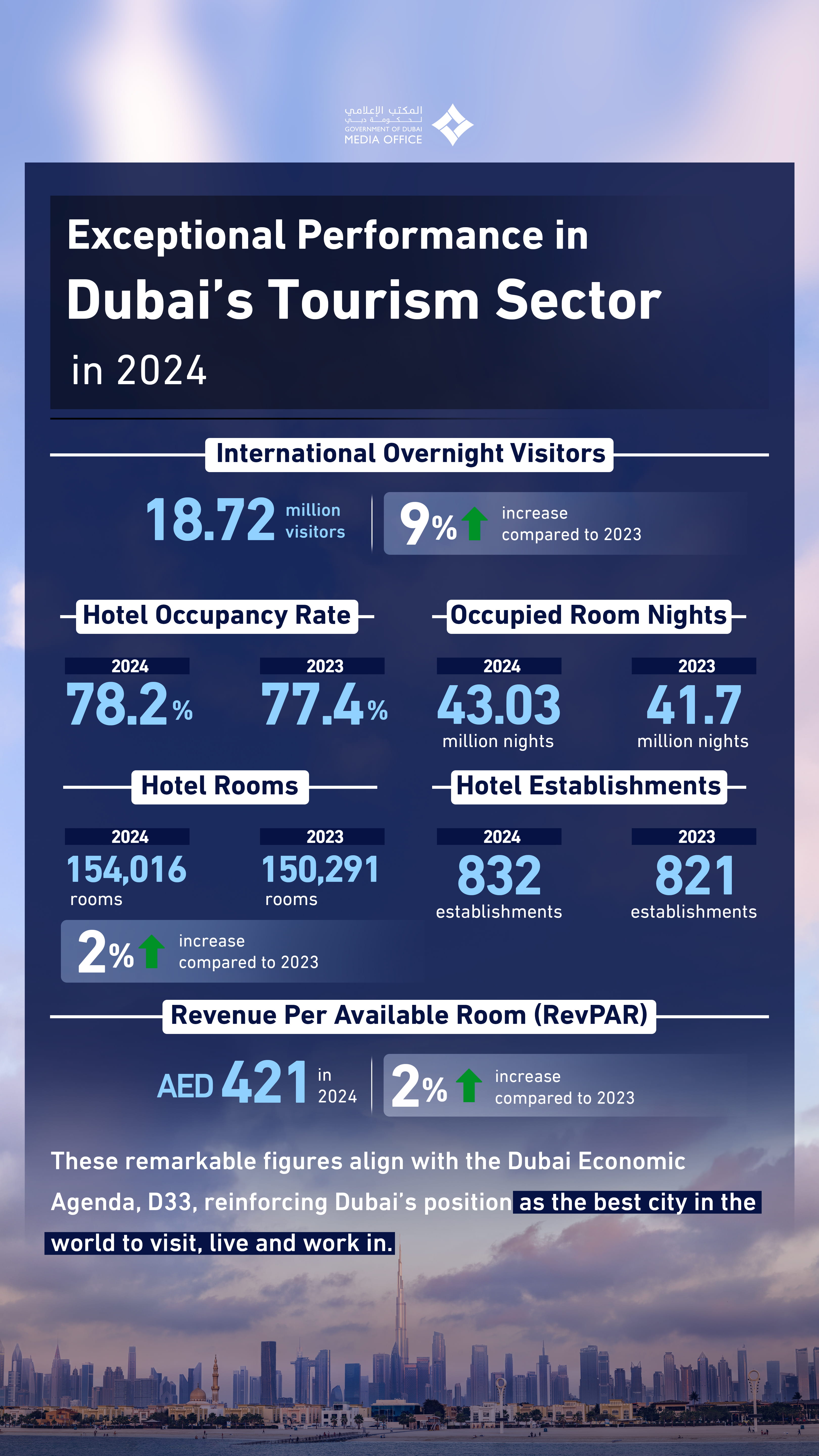 His Excellency Issam Kazim, CEO of the Dubai Corporation for Tourism and Commerce Marketing (DCTCM), said: “Dubai’s remarkable tourism performance in 2024 reflects the sustained commitment and strategic efforts of our extensive network of partners and stakeholders, and the guidance of our city’s visionary leadership. Our market strategy, built on bespoke and diversified campaigns, has been pivotal in showcasing Dubai’s diverse tourism offerings to the world, and we have leveraged strong partnerships with private and public sector organisations and individuals to enhance our global reach and promote Dubai as a leading hub for business, leisure, and innovation. These collaborations have not only intensified our international efforts, but also made Dubai the destination of choice for new and returning visitors, with an increasing number of them finding the city appealing to relocate to, on a more permanent basis. A powerful sense of community among the almost 200 nationalities living in Dubai is also seeing more residents advocate for the city, inviting and hosting their friends and family to experience it for themselves. As we aim to build on this momentum throughout 2025, we are committed to maintaining the highest standards of service and continuously innovating to exceed expectations, whether for tourists visiting for the first time, or for loyal repeat guests and residents exploring the city and enjoying its lifestyle offerings.”